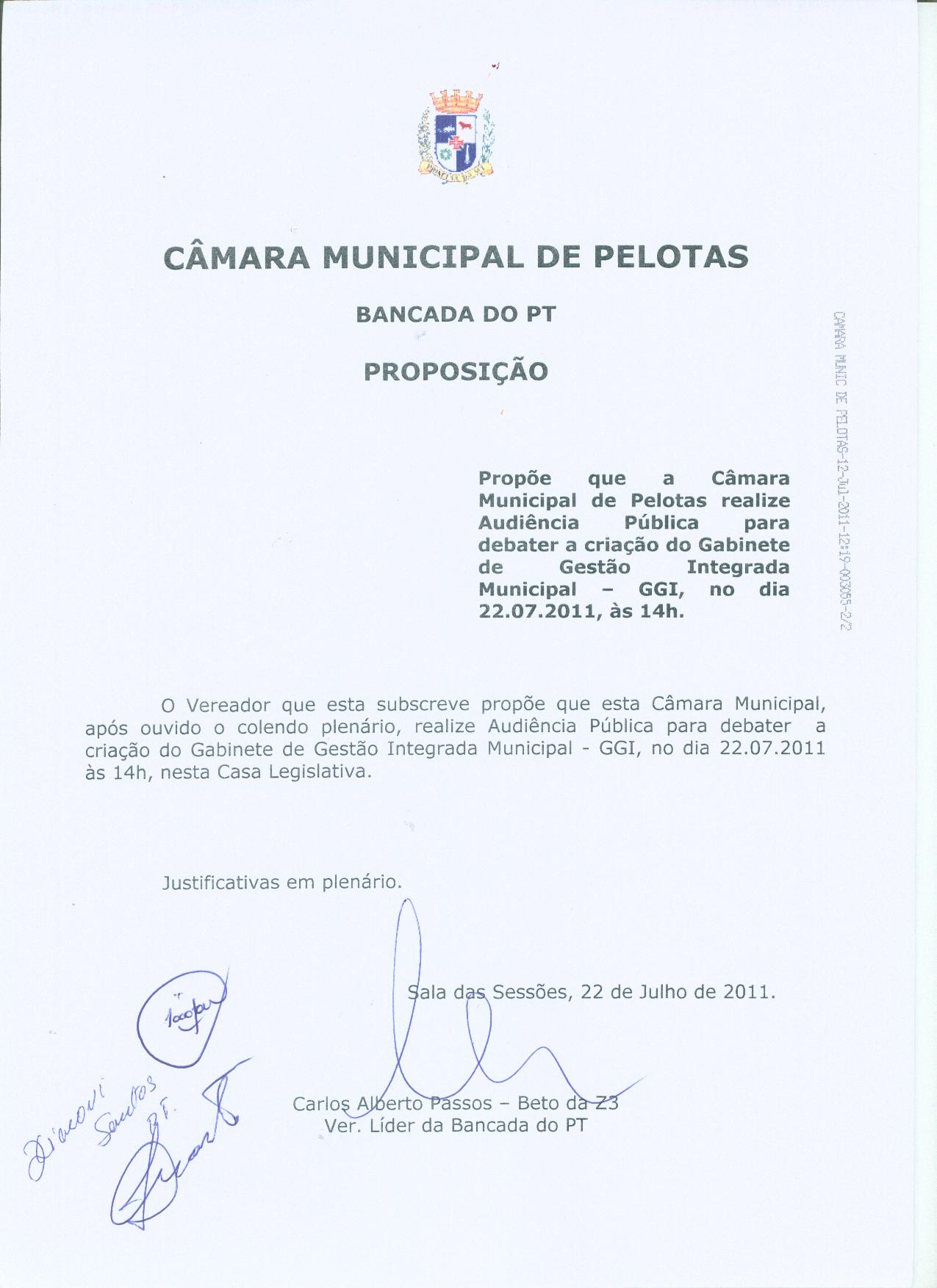 Ementa: PROPÕE QUE A CÂMARA MUNICIPAL DE PELOTAS REALIZE AUDIÊNCIA PÚBLICA PARA DEBATER A CRIAÇÃO DE GABINETE DE GESTÃO INTEGRADA MUNICIPAL - GGI, NO DIA 22.07.2011, ÀS 14H.