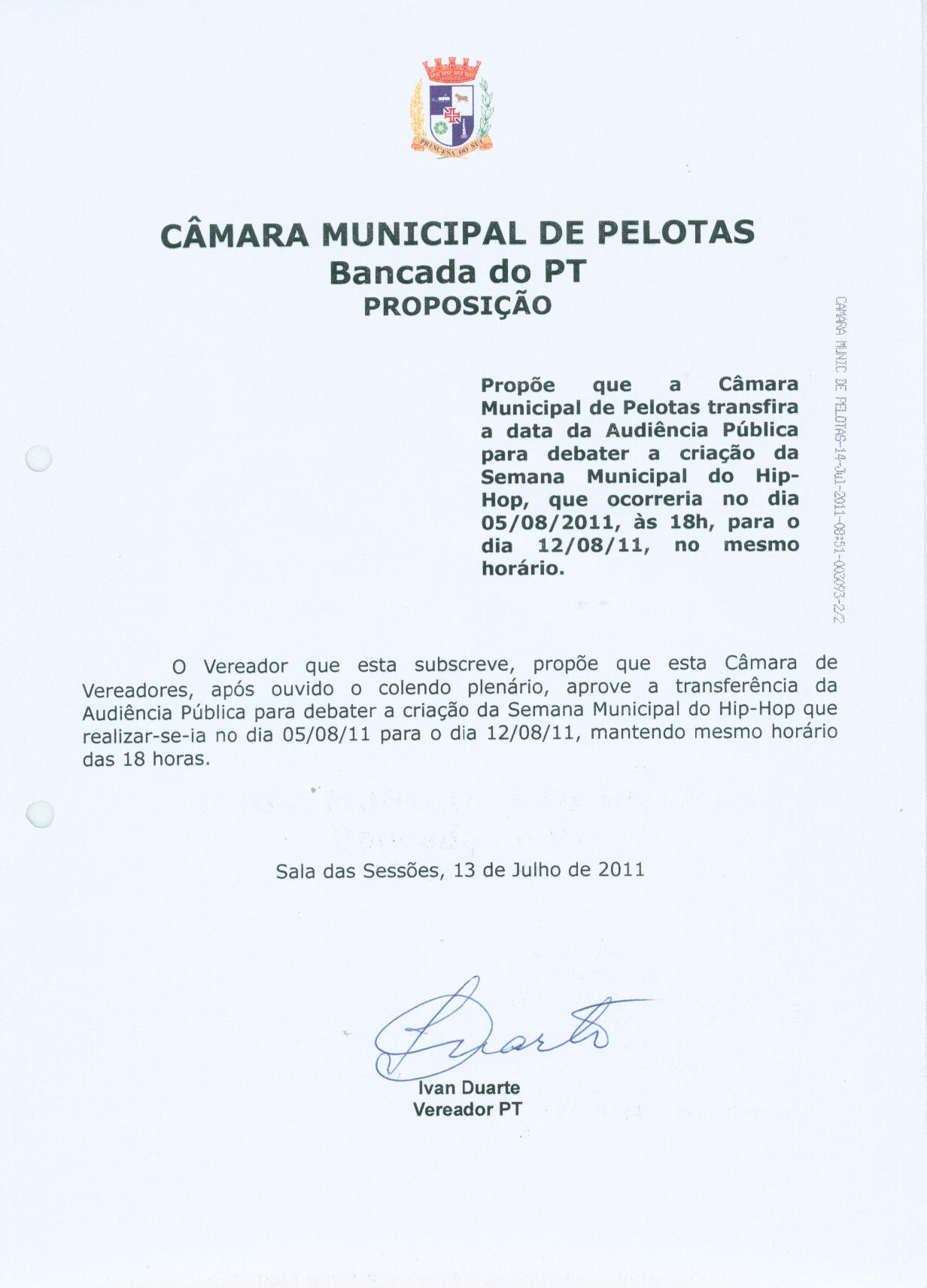 Ementa: PROPÕE QUE A CÂMARA MUNICIPAL DE PELOTAS TRANSFIRA A DATA DA AUDIÊNCIA PÚBLICA PARA DEBATER A CRIAÇÃO DA SEMANA MUNICIPAL DO HIP HOP, QUE OCORRERIA NO DIA 05/08/2011. ÀS 10H, PAEA O DIA 12/08/11, NO MESMO HORÁRIO.