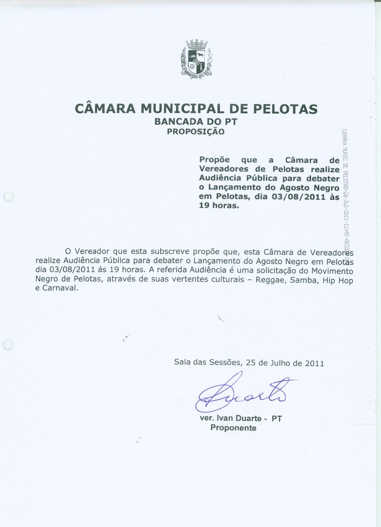 Ementa: PROPÕE QUE A CÂMARA DE VEREADORES DE PELOTAS REALIZE AUDIÊNCIA PÚBLICA PARA DEBATER O LANÇAMENTO DO AGOSTO NEGRO EM PELOTAS, DIA 03/08/2011 ÀS 19 HORAS.