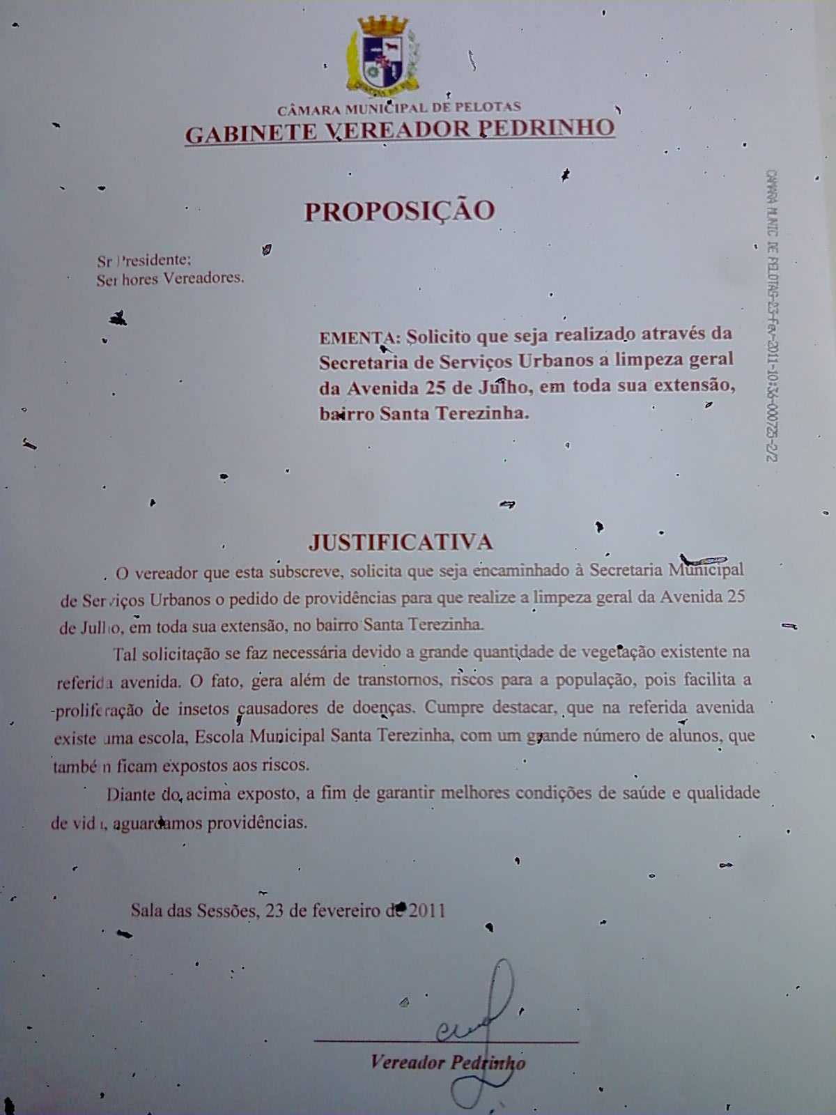 Ementa: O VEREADOR QUE ESTA SUBSCREVE PROPÕE QUE, APÓS OUVIDO O COLENDO PLENÁRIO, SEJA ENCAMINHADO AO PODER EXECUTIVO O PEDIDO PARA EFETUAR LIMPEZA, ROÇADO E COMBATER A INFESTAÇÃO DE MOSQUITOS NO BAIRRO FRAGATA EM ESPECIAL NA VILA VERONA, ENTORNO DA ESCOLA VISCONDE DE SOUZA SOARES.